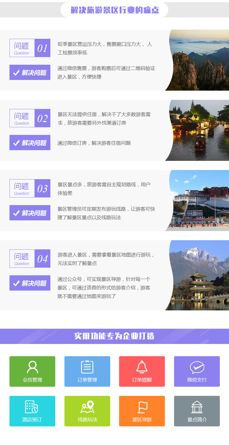 会员管理    订单管理    订单提醒    微信支付    酒店预越    线路玩法    景区导游    景点介绍